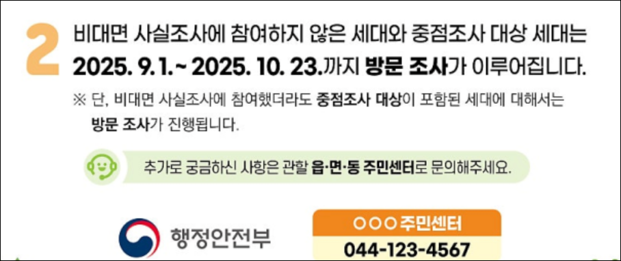 조사에 참여하지 못한 세대와 중점조사 대상 세대는 9월 1일부터 10월 23일까지 대면 조사가 진행됩니다.