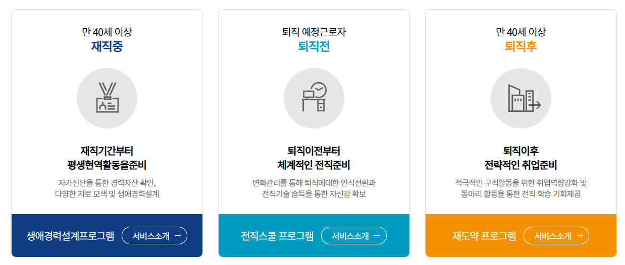 이 서비스는 단순한 교육을 넘어 자가진단, 유형별 경력 가이드, 1:1 상담을 통해 개인 맞춤형 경력 전략을 수립할 수 있도록 설계되어 있습니다. 특히 연령대별로 차별화된 프로그램이 운영됩니다.