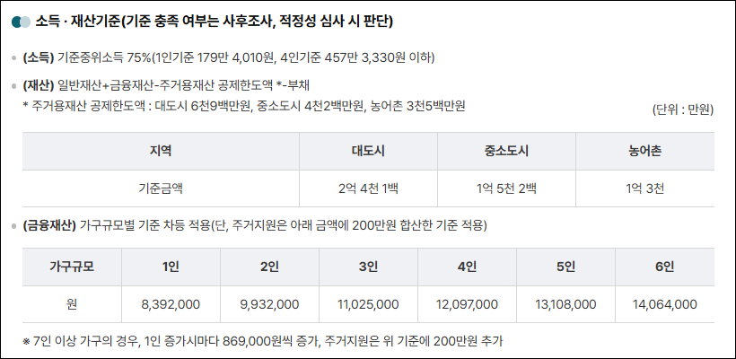 예를 들어, 4인 가구는 금융재산이 12,097,000원 이하여야 하며, 주거지원 시에는 14,097,000원까지 허용됩니다.