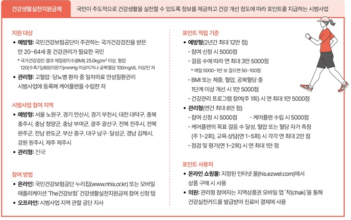 건강관리공단은 국민의 건강 위험 요인을 줄이고 건강생활 실천을 유도하기 위해 건강생활실천지원금제를 전국 24개 지역에서 시범 운영하고 있습니다. 참여 유형은 ‘예방형’과 ‘관리형’으로 구분되며, 두 유형 중 한 가지에 해당하고 주민등록 주소지가 시범사업 지역에 있다면 참여할 수 있습니다. 건강생활실천지원금제 운영처예방형은 최근 6개월 이내 국가건강검진을 받은 만 20~64세 국민 중 체질량지수(BMI), 혈압, 공복혈당 등이 일정 기준을 넘어 건강관리가 필요한 대상자입니다. 관리형은 고혈압·당뇨병 환자 중 일차의료만성질환관리 시범사업에 등록된 경우를 말합니다. 예방형·관리형 참여 대상 확인 방법본인이 건강생활실천지원금제 참여 대상인지 확인하려면 건강관리공단 누리집(www.nhis.or.kr..