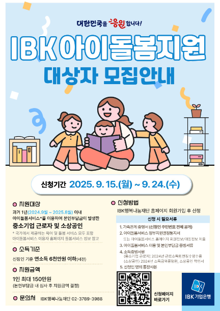 아이 돌봄 서비스는 맞벌이 가정이나 돌봄이 필요한 가정에 큰 도움이 되는 제도입니다. 이러한 부담을 덜어주기 위해 IBK기업은행은 매년 ‘IBK 아이돌봄지원 사업’을 통해 중소기업 근로자 및 소상공인을 대상으로 돌봄 비용을 지원하고 있습니다. 기업은행 아이돌봄 지원금이번 모집 안내는 2025년 9월 15일(월)부터 9월 24일(수)까지 신청을 받고 있습니다.지원 대상 및 신청 조건IBK 아이돌봄지원 사업의 주요 대상은 중소기업 근로자 및 소상공인입니다. 특히 지난 1년간(2024년 9월 ~ 2025년 8월) 아이돌봄서비스를 이용하며 본인 부담금이 발생한 가정이 해당됩니다. 즉, 이미 서비스를 이용해 돌봄 비용을 지출한 경험이 있어야만 신청 자격이 주어집니다.소득 기준은 신청 가정의 월 소득이 건보료 기준..
